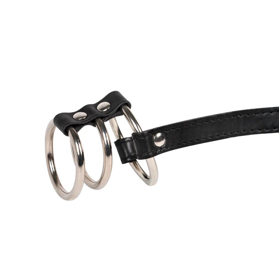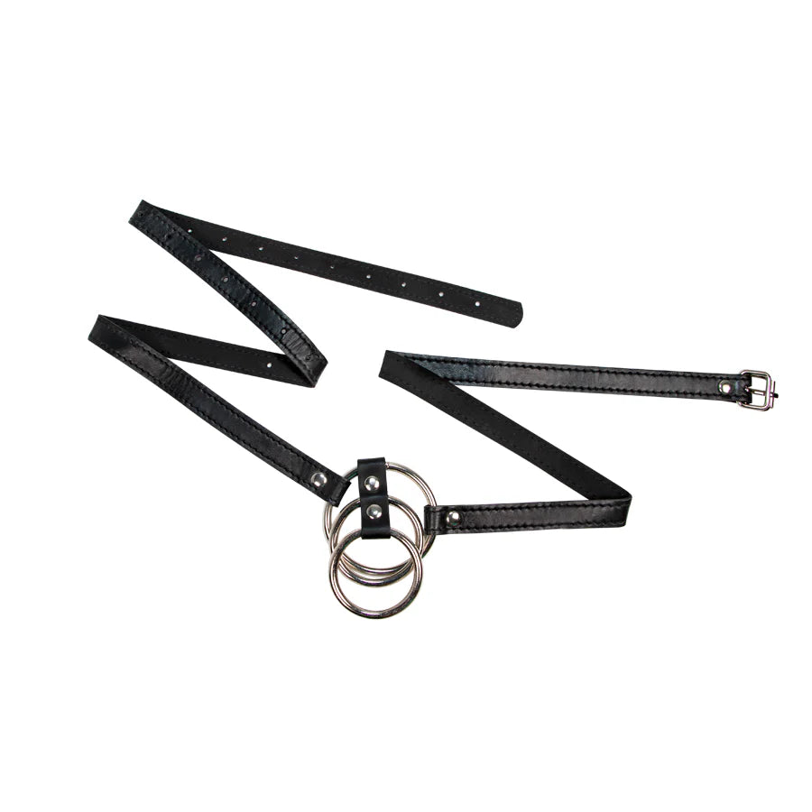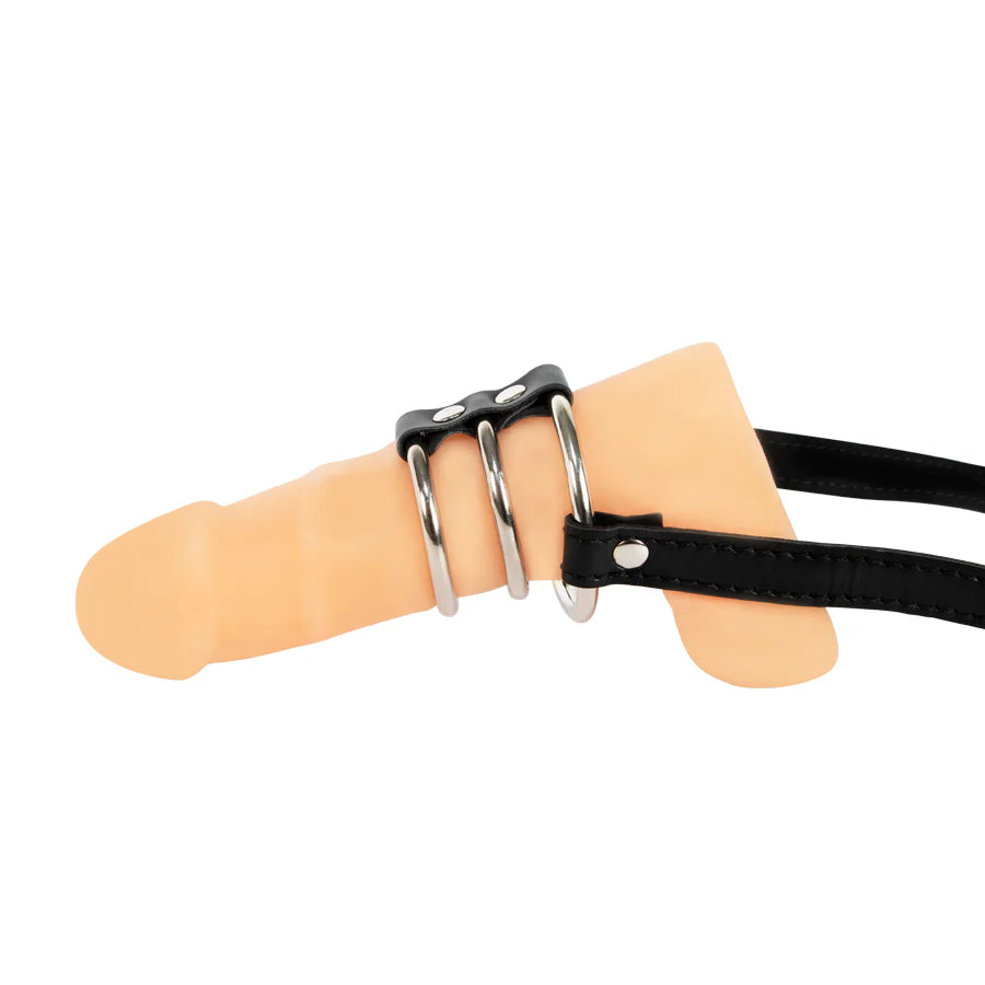 Anillo para el pene con tres aros metálicos y correa de cuero sintético para amarrar a la cintura y darle mayor y estabilidad.