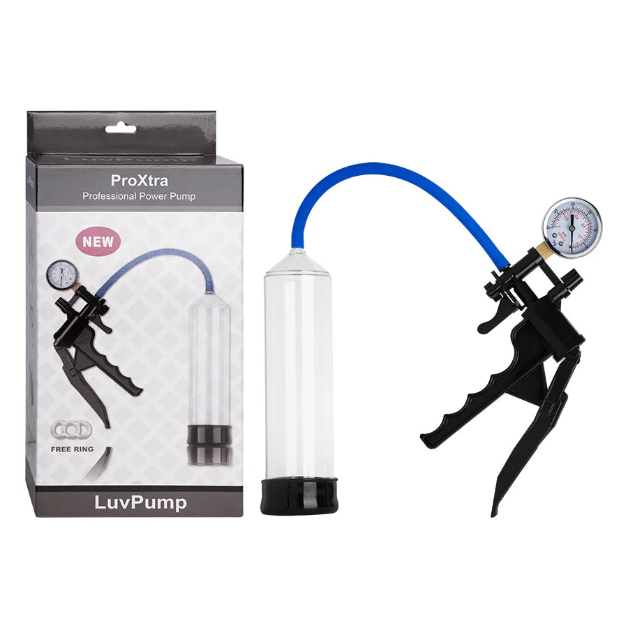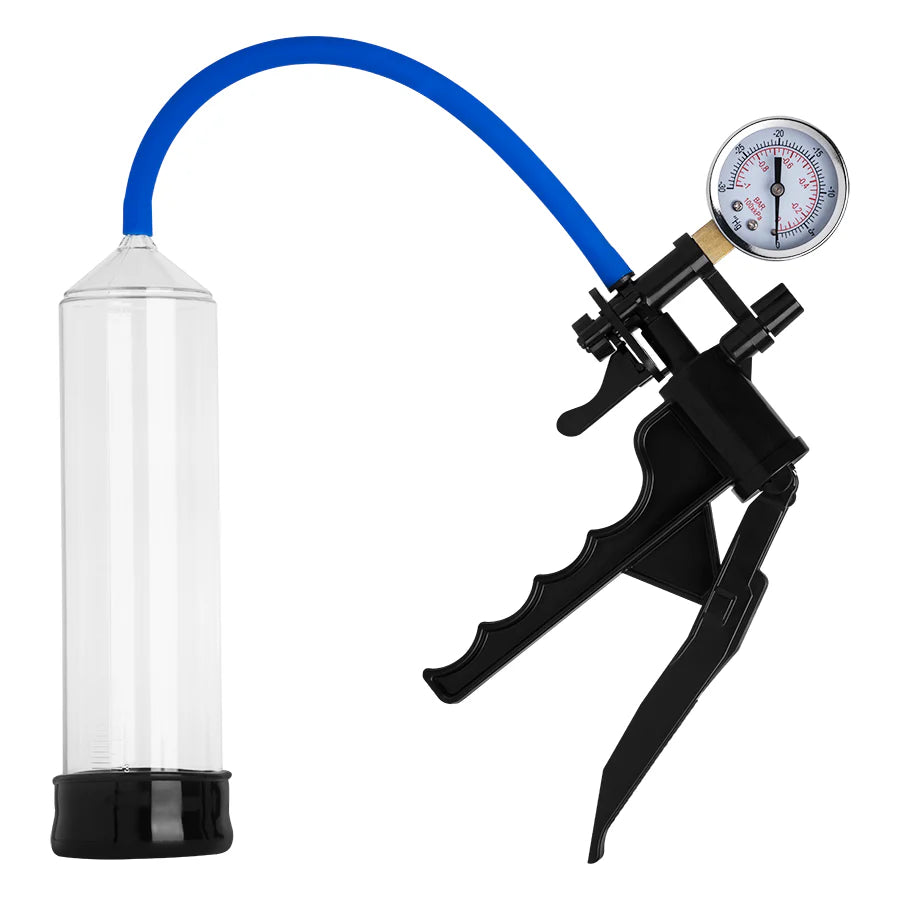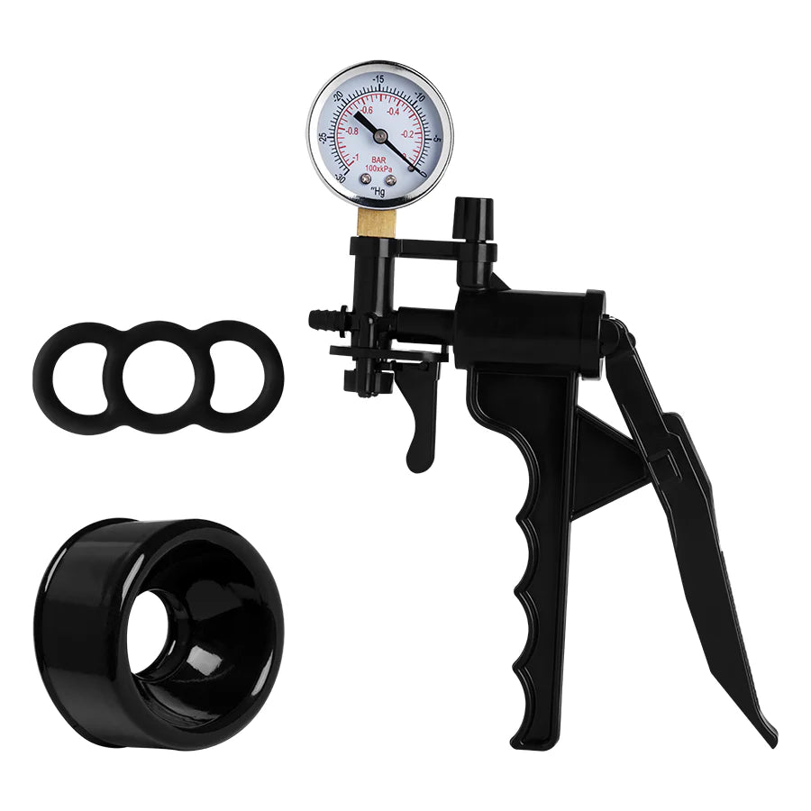 3. Oprima el boton de succion de aire. Habrá una pequeña sensación de estiramiento del pene mientras el aire sale por la manguera. Para principiantes, es importante comenzar este proceso lentamente para evitar incomodidad. Recuerda activar la valvula de escape de aire en caso de sentir dolor.