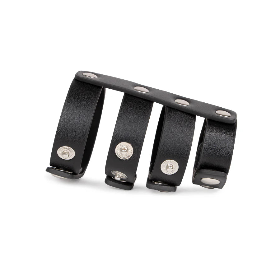 Anillo para el pene fabricado en material de cuero sintético. Con cuatro cuerdas ajustables para graduar la presión.