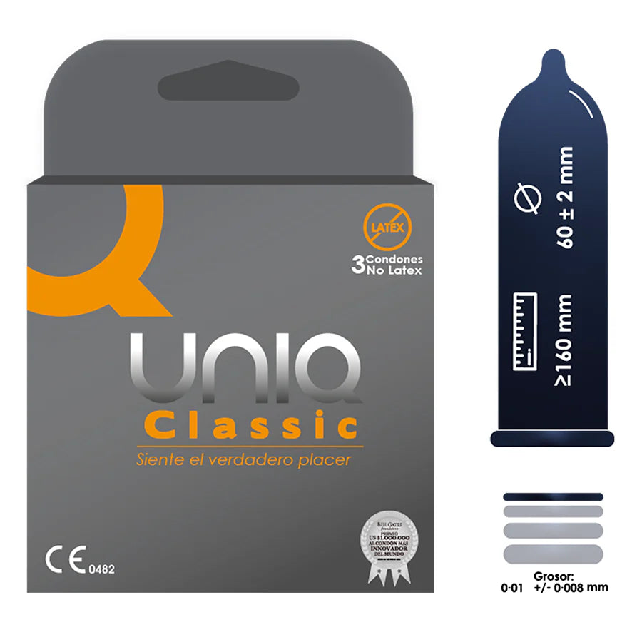 Desarrollado para uso exclusivo masculino, similar a los condones tradicionales en su forma; cada paquete incluye 3 condones.