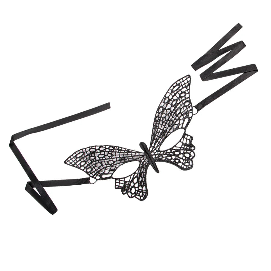 Antifaz en hilo rígido con forma de mariposa y sistema de amarre en cintas.