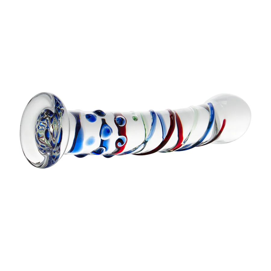 Dildo de vidrio delgado con pequeñas rayas 3D en su cuerpo para brindar diferentes sensaciones.