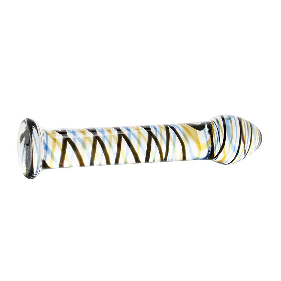 Dildo de vidrio con líneas de colores para darle un toque visual único.