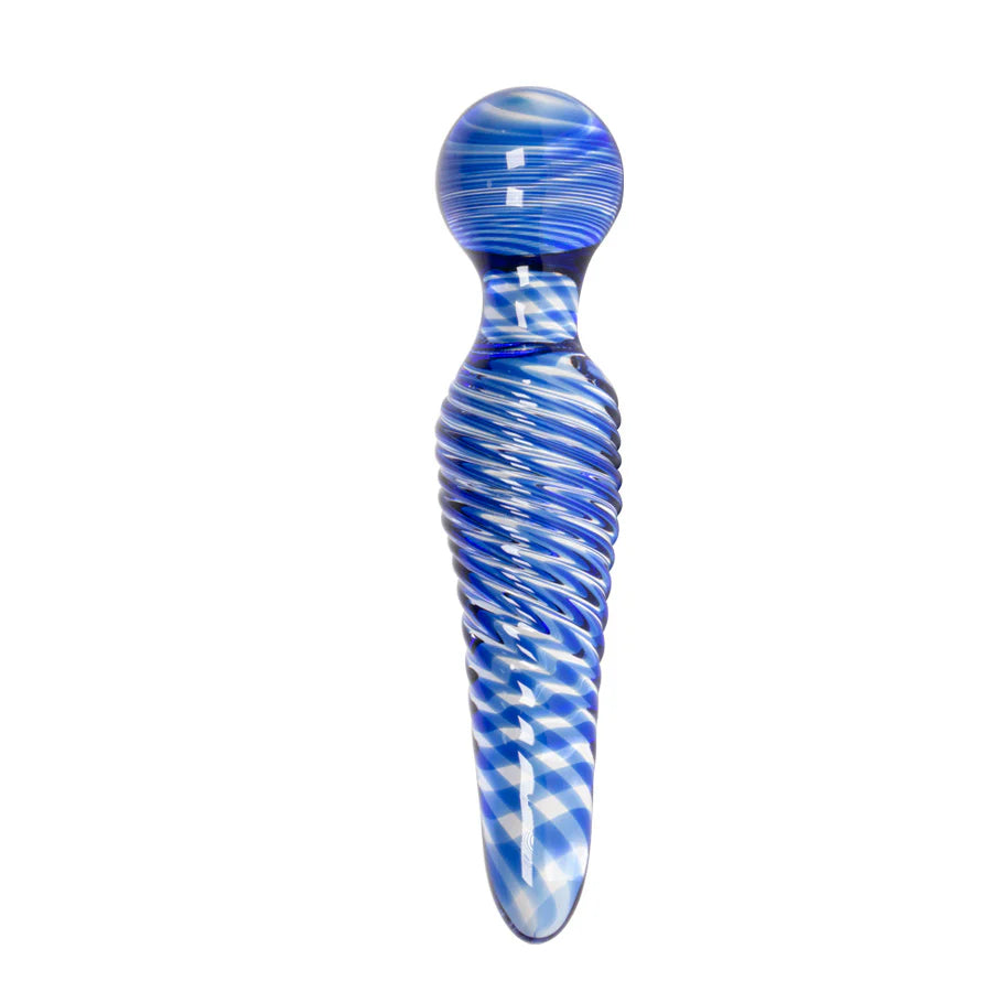 Dildo de vidrio con forma de micrófono y textura en espiral por todo su cuerpo.