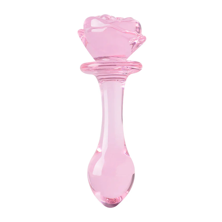 Plug anal de cristal con textura lisa y una rosa decorativa en la base.