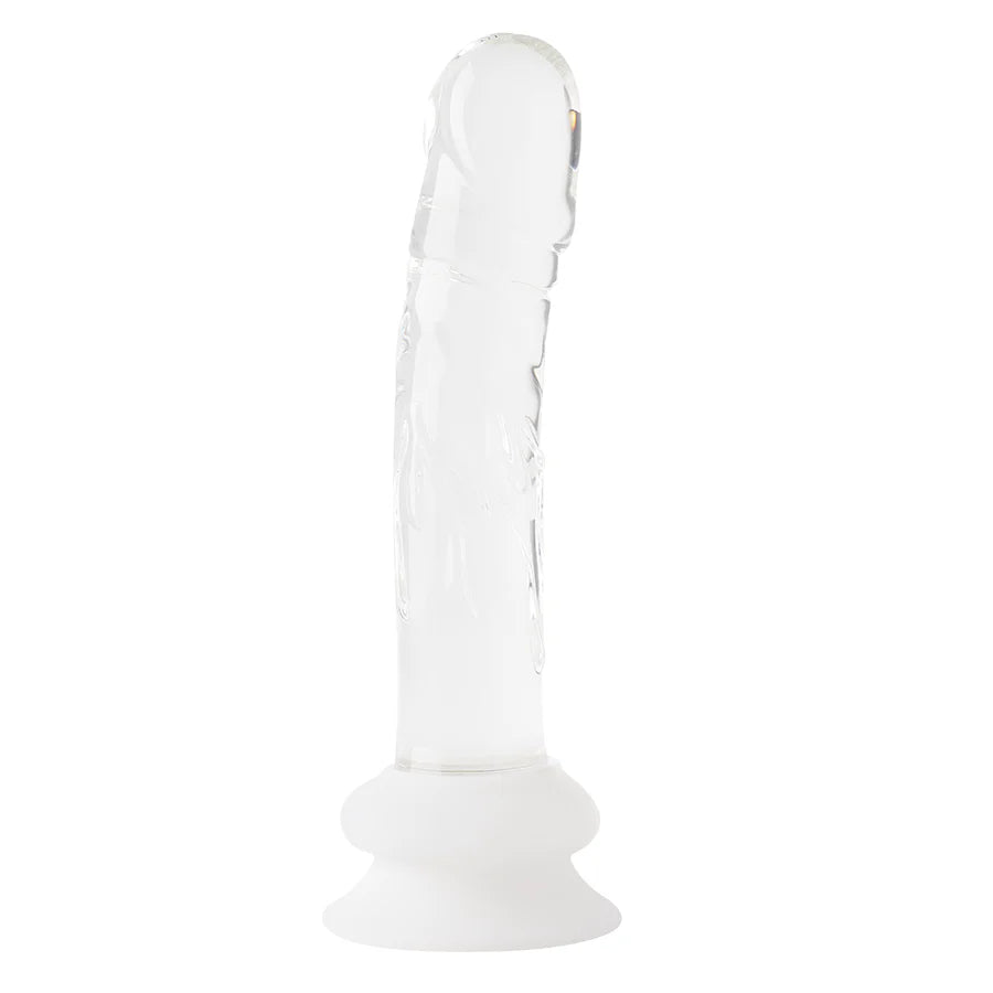 Dildo de vidrio con cabeza realista y cuerpo venoso en 3d, su base es de silicona y es de fácil adherencia a superficies.