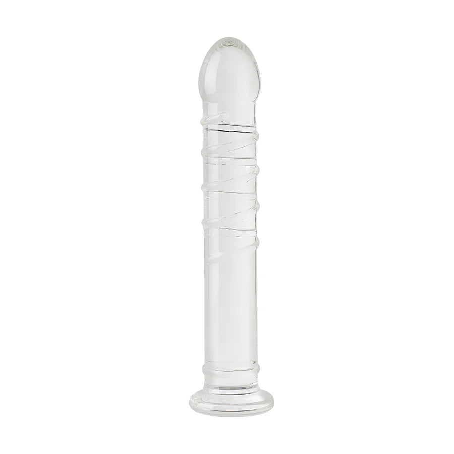 dildo de vidrio con cabeza redonda, linea en forma de esprial en su cuerpo y base.
