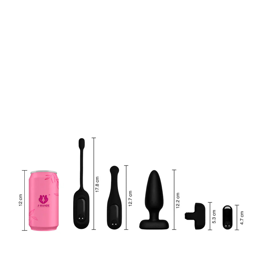Incluye 4 juguetes con bala vibradora intercambiable y control remoto inalámbrico. Cuenta con 9 modos de vibración para explorar con cada uno de los juguetes.