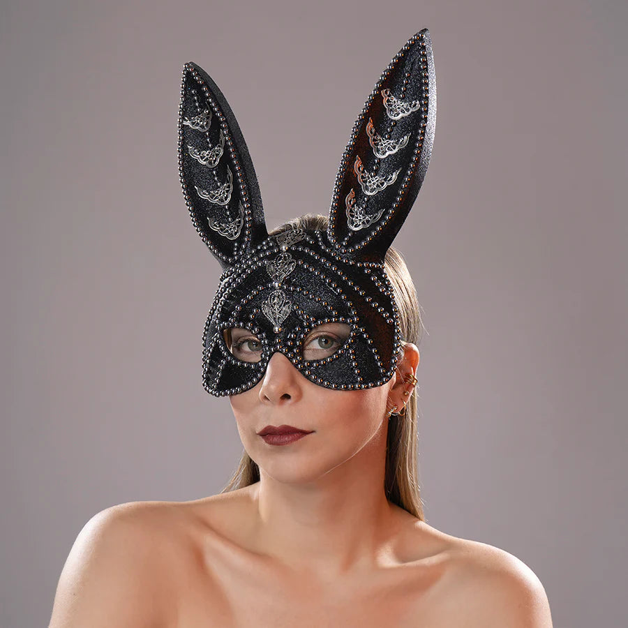 Máscara sexy con orejas de conejo, decorada con cadeneta en círculos y pequeños grabados.