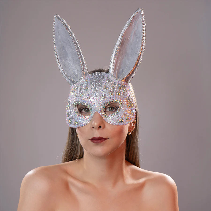 Máscara sexy con orejas de conejo, decorada con unas hermosas piedras imitación de murano y plumas en sus orejas.
