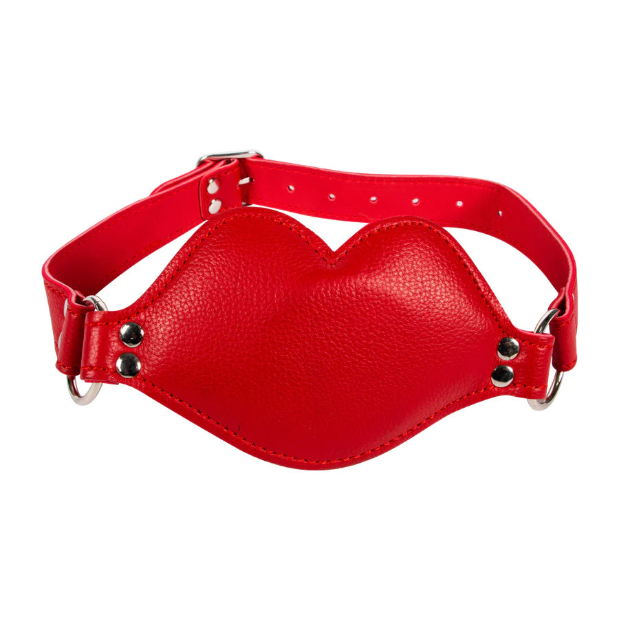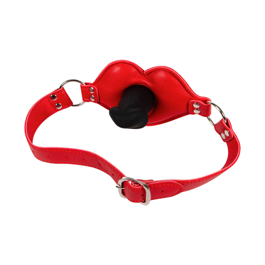 Correa con forma externa de labios y extensión interior de chupete en forma de pene para juegos fetish y prácticas BDSM.