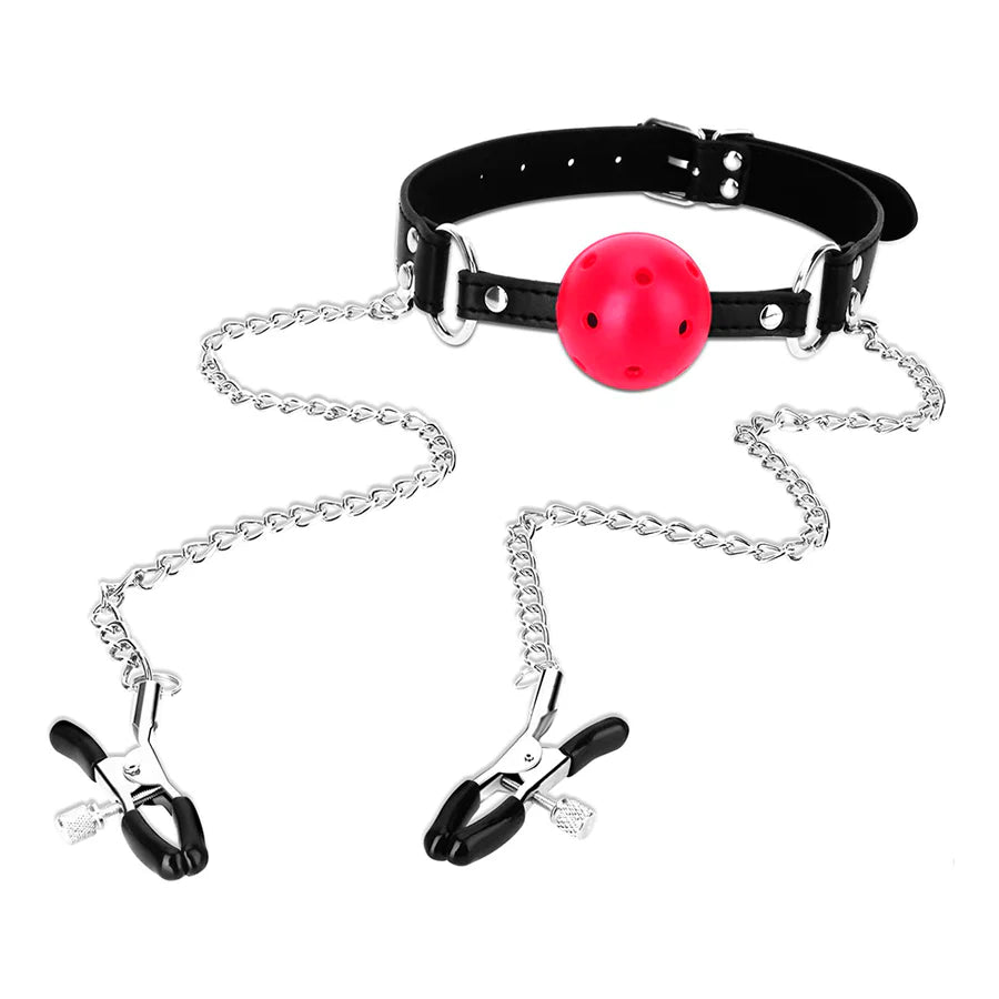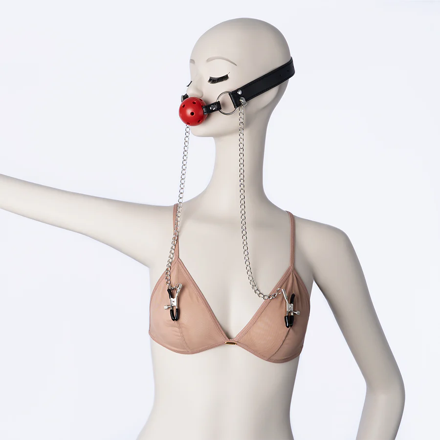 Collar con bola de Ball gag y extensión de cadena para los pezones.