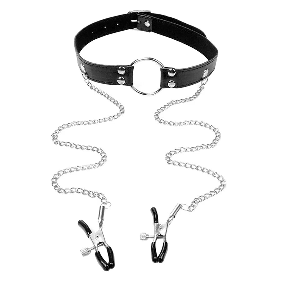 Collar con anillo en el medio para hacerle sexo oral a tu pareja y extensión de cadena para los pezones.
