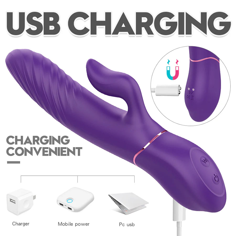 Vibrador de doble estimulación con función de temperatura y fuerza de empuje.