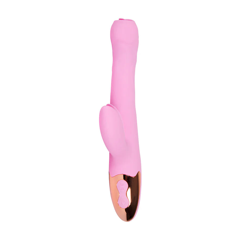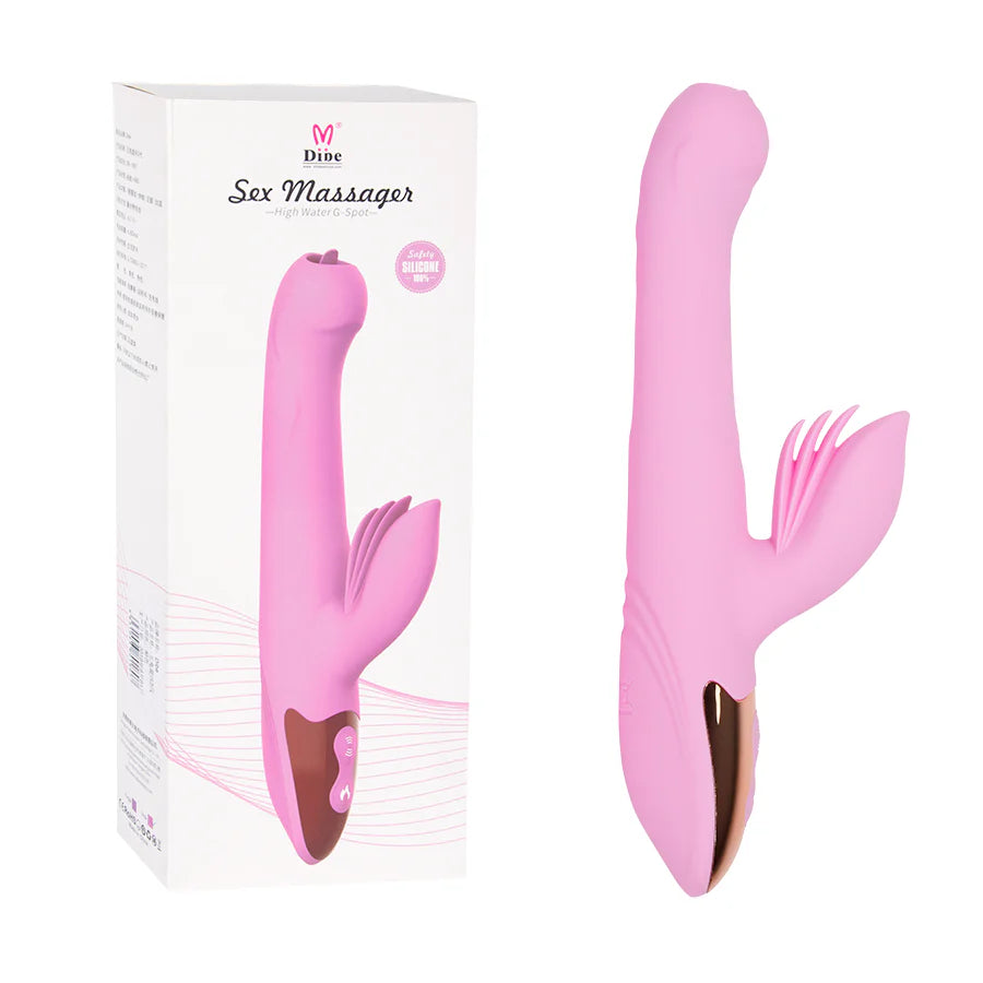 Vibrador de doble potencia. Cuenta en la parte superior con una lengua para una estimulación del punto G y realiza movimientos circulares y el estimulador clitorial tiene tres lenguitas anexas que se mueven de forma rápida para simular sexo oral.